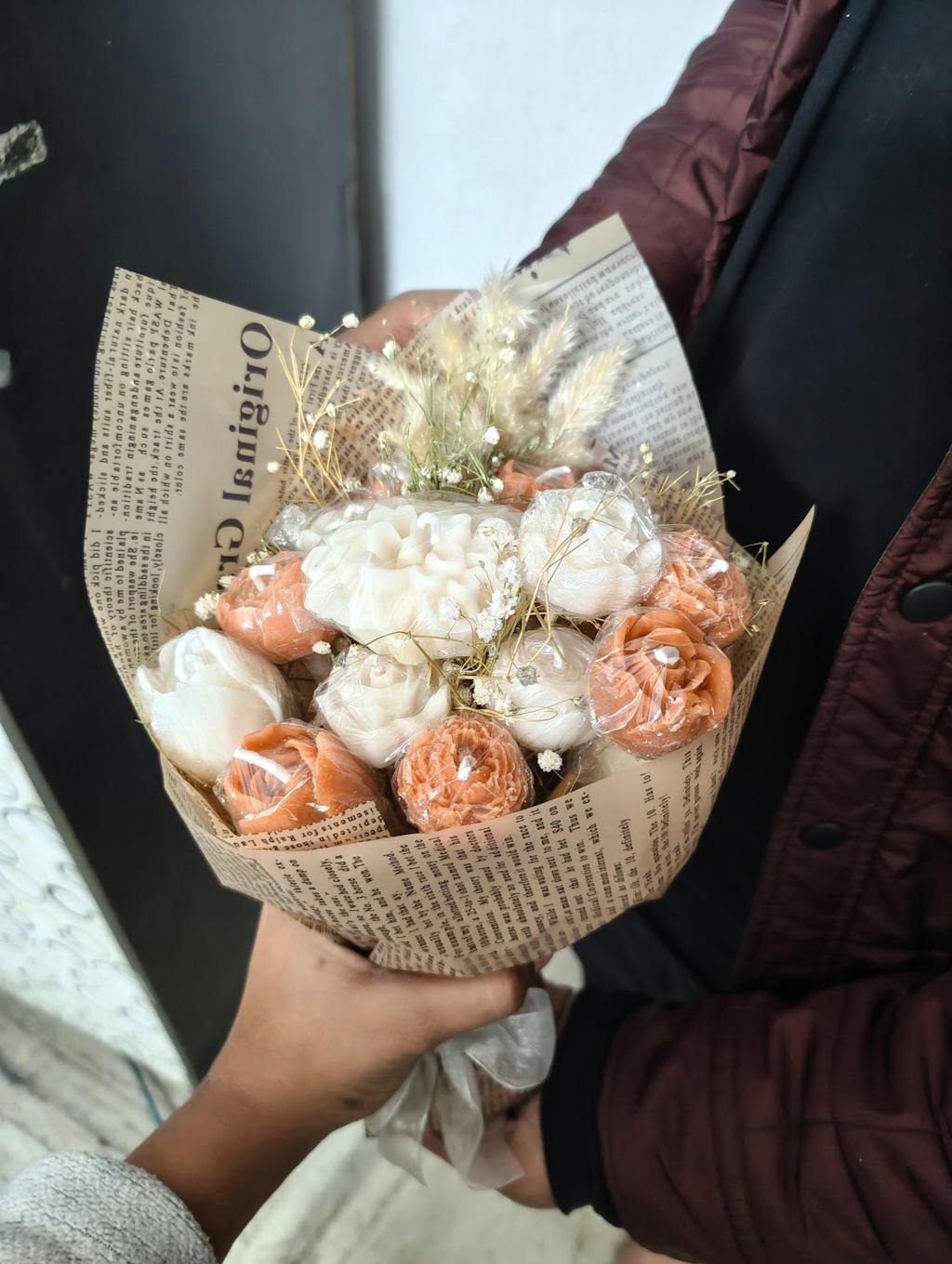 Peach and White Scented Bouquet with Flower Melts | Floral Fragrance | Premium Soy Wax | Peach, White | Ceramic Tray Included (FREE)